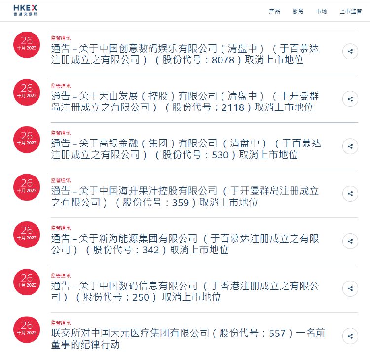 其中,仅10月26日一天,就有6家公司被港交所勒令退市。这显示,香港监管对建设高质量市场的决心日益强烈。