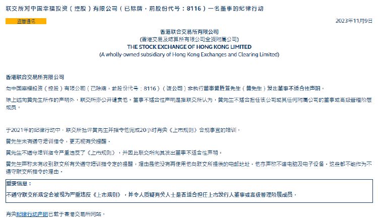 11月9日,中国幸福投资(控股)有限公司(已除牌公司)非执行董事黄胜蓝遭到港交所采取了纪律行动,港交所发出董事不适合性声明,认为黄胜蓝不适合担任该公司或其任何附属公司的董事或高级管理阶层成员。同时他还被港交所公开谴责。