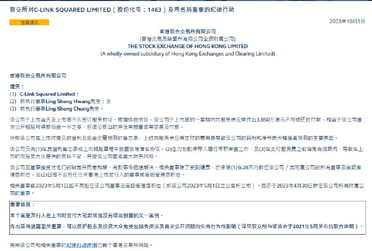 在对C-LINK SQUARED LIMITED及两名前董事采取纪律行动时,港交所表示,本个案是发行人在上市时支付大笔款项而没有适当披露的案例。