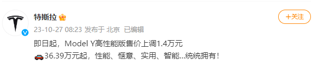10月27日,特斯拉Model Y高性能版在中国涨价1.4万元;