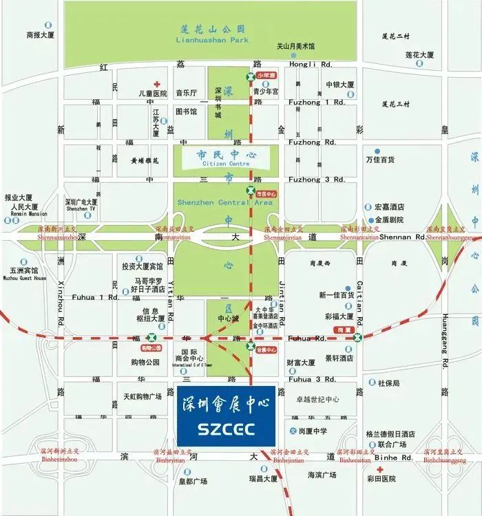 🚌会展中心东侧金田路、西侧益田路、南侧滨河路、北侧福华三路均有公交站点。