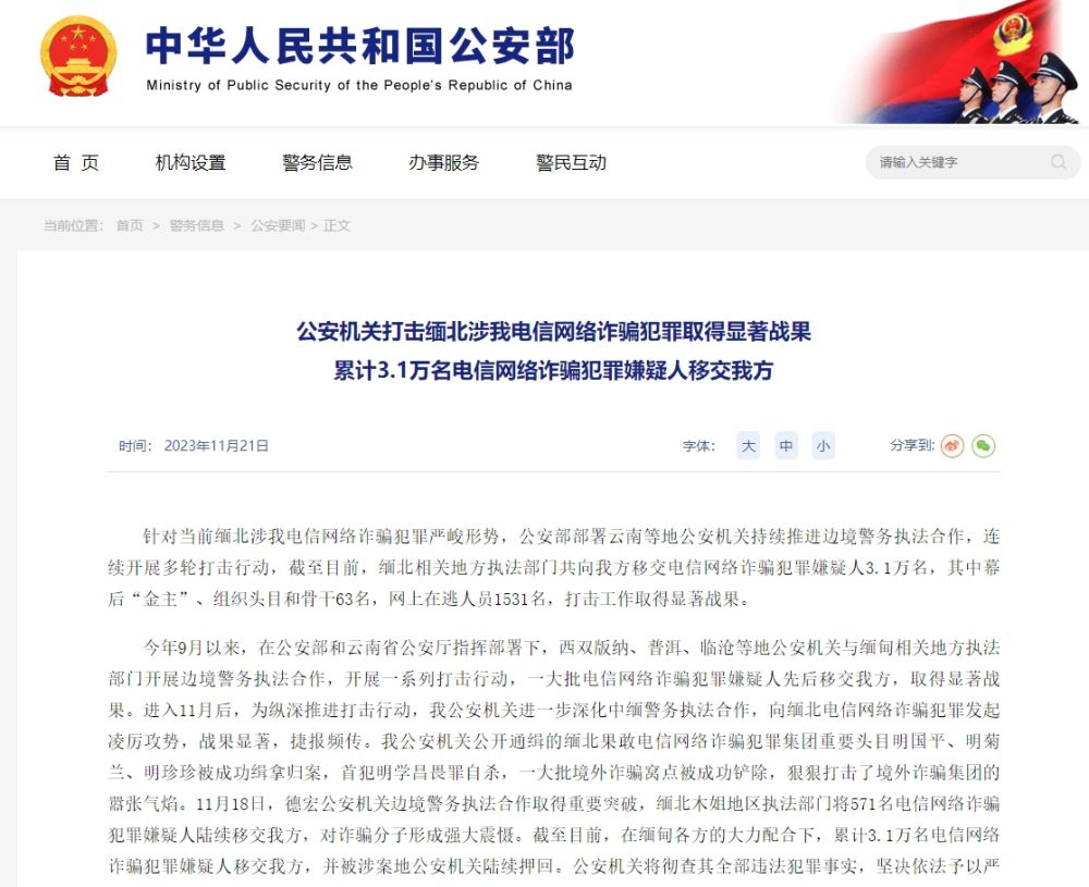 今年9月以来,在公安部和云南省公安厅指挥部署下,西双版纳、普洱、临沧等地公安机关与缅甸相关地方执法部门开展边境警务执法合作,开展一系列打击行动,一大批电信网络诈骗犯罪嫌疑人先后移交我方,取得显著战果。进入11月后,为纵深推进打击行动,我公安机关进一步深化中缅警务执法合作,向缅北电信网络诈骗犯罪发起凌厉攻势,战果显著,捷报频传。我公安机关公开通缉的缅北果敢电信网络诈骗犯罪集团重要头目明国平、明菊兰、明珍珍被成功缉拿归案,首犯明学昌畏罪自杀,一大批境外诈骗窝点被成功铲除,狠狠打击了境外诈骗集团的嚣张气焰。11月18日,德宏公安机关边境警务执法合作取得重要突破,缅北木姐地区执法部门将571名电信网络诈骗犯罪嫌疑人陆续移交我方,对诈骗分子形成强大震慑。截至目前,在缅甸各方的大力配合下,累计3.1万名电信网络诈骗犯罪嫌疑人移交我方,并被涉案地公安机关陆续押回。公安机关将彻查其全部违法犯罪事实,坚决依法予以严惩。