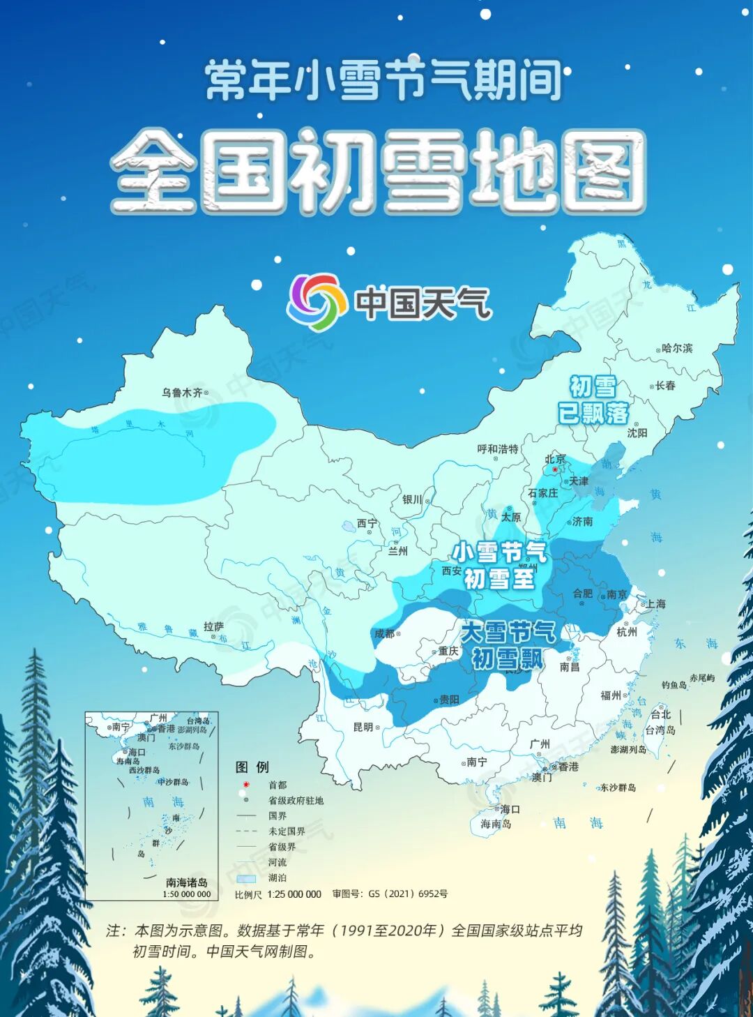 从中国天气网推出的小雪节气期间全国初雪地图可以看出,常年华北、黄淮一带会在小雪节气期间迎来初雪,大城市中,北京、天津、石家庄、太原、济南、郑州、西安等地多在这一时节飘落冬天的第一场雪。