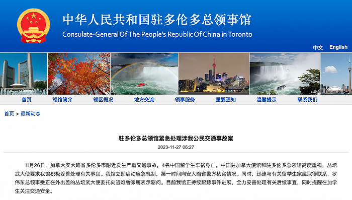 据中国驻多伦多总领事馆消息,11月26日,加拿大安大略省多伦多市附近发生严重交通事故,4名中国留学生车祸身亡。中国驻加拿大使馆和驻多伦多总领馆高度重视,丛培武大使要求我馆积极妥善处理有关事宜。我馆立即启动应急机制,第一时间向安大略省警方核实情况。同时,迅速与有关留学生家属取得联系,罗伟东总领事受正在外出差的丛培武大使委托向遇难者家属表示慰问。目前我馆正持续跟踪事件进展,全力妥善处理有关后续事宜,同时提醒在加学生关注交通安全。