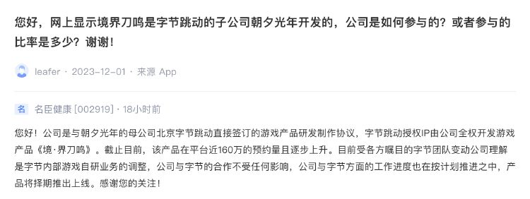 近日,名臣健康(002919)在互动平台表示,公司是与朝夕光年的母公司北京字节跳动直接签订的游戏产品研发制作协议,字节跳动授权IP由公司全权开发游戏产品《境·界刀鸣》。截至目前,该产品在平台近160万的预约量且逐步上升。目前受各方瞩目的字节团队变动公司理解是字节内部游戏自研业务的调整,公司与字节的合作不受任何影响,公司与字节方面的工作进度也在按计划推进之中,产品将择期推出上线。