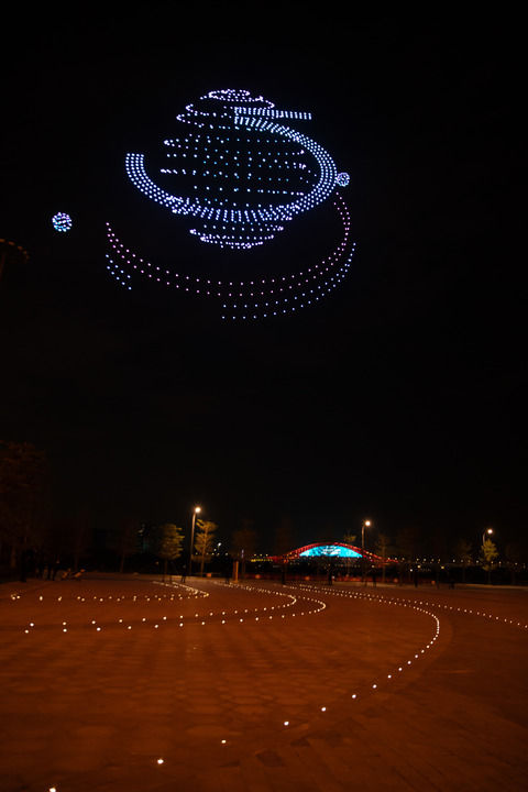 这是12月2日晚在广州南沙国际金融论坛永久会址拍摄的世界媒体峰会无人机表演。新华社记者 金立旺 摄