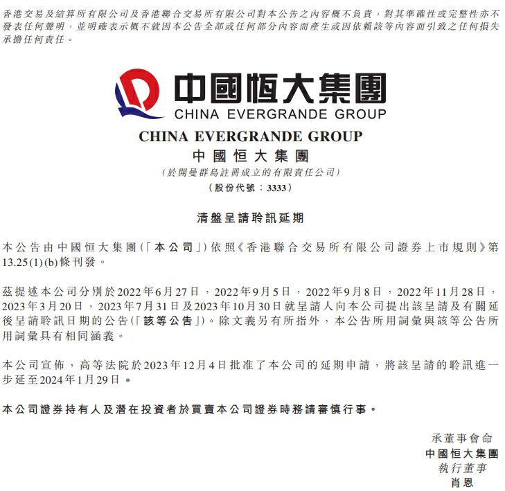 12月4日午间,中国恒大在港交所公告称,高等法院于2023年12月4日批准了本公司的延期申请,将清盘呈请聆讯进一步延至2024年1月29日。
