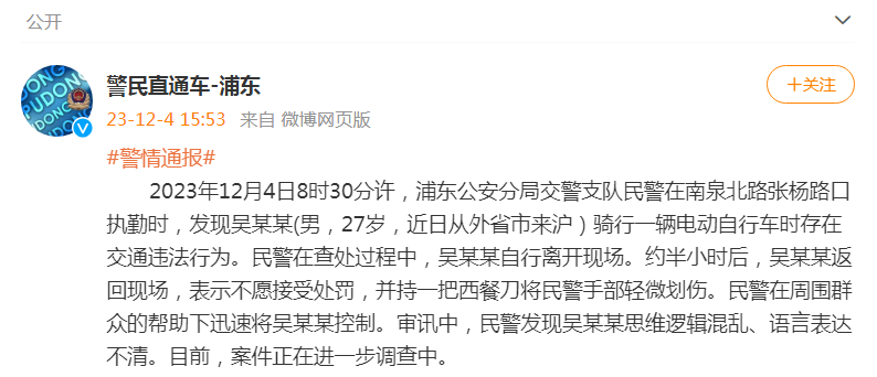2023年12月4日8时30分许,浦东公安分局交警支队民警在南泉北路张杨路口执勤时,发现吴某某(男,27岁,近日从外省市来沪)骑行一辆电动自行车时存在交通违法行为。民警在查处过程中,吴某某自行离开现场。约半小时后,吴某某返回现场,表示不愿接受处罚,并持一把西餐刀将民警手部轻微划伤。民警在周围群众的帮助下迅速将吴某某控制。审讯中,民警发现吴某某思维逻辑混乱、语言表达不清。目前,案件正在进一步调查中。