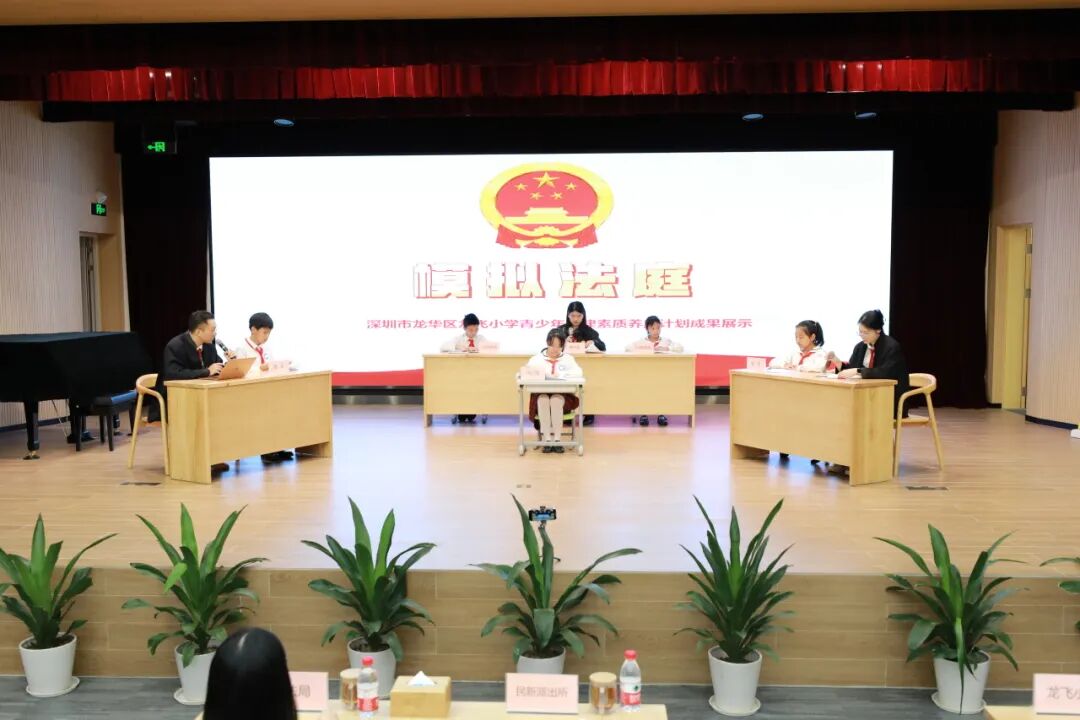 龙华区龙飞小学则举行了模拟法庭进校园活动。学生们在龙华区司法局、民法博物馆的大力支持下,纷纷化身“人民陪审员”“书记员”“原告”“被告”等角色,亲身体验从庭前准备、法庭调查到法庭辩论、宣判环节等庭审全过程。活动把情景演绎和普法教育有机结合,让同学们“零距离”接受法律熏陶,进一步引导青少年法治意识。