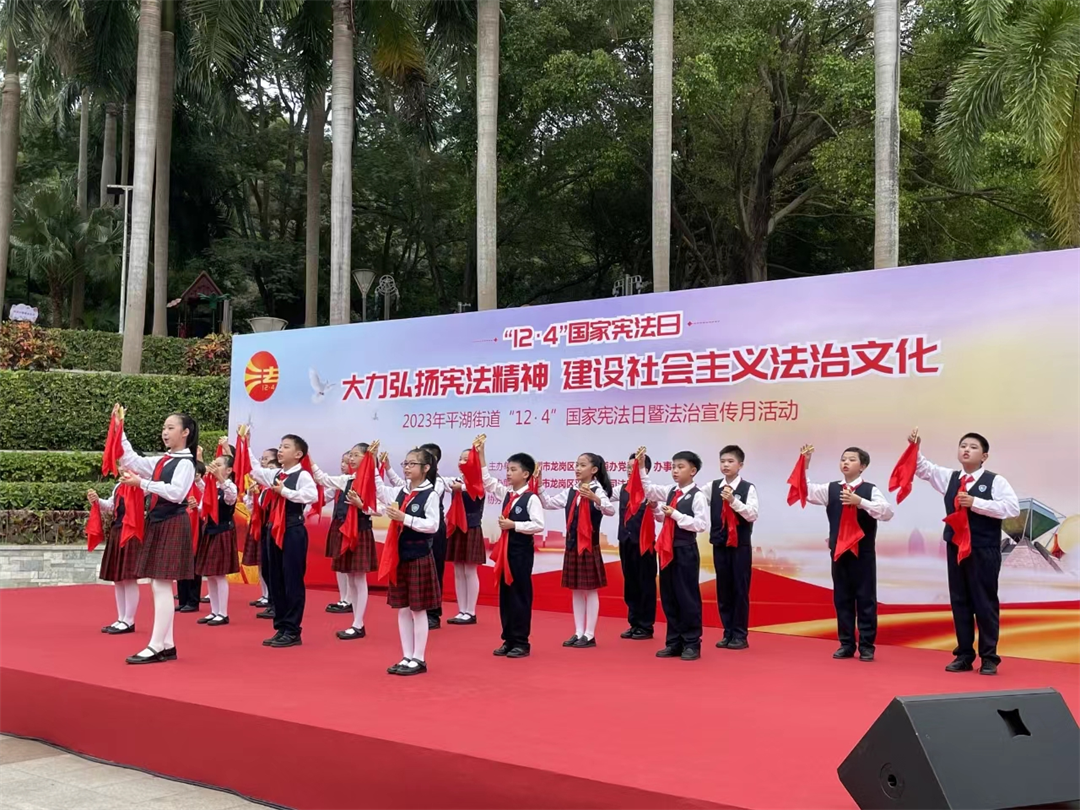 龙岗区凤凰山小学普法社团参加平湖街道司法所2023年宪法日普法宣传活动,展演花样快板《法治宣传谱新篇》,生动有趣地宣传了法律知识。