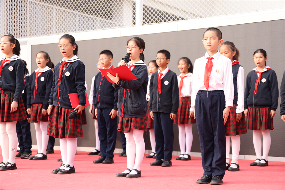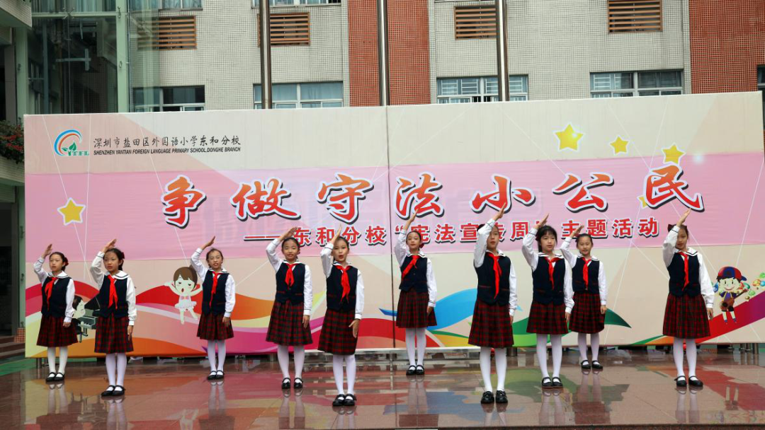 盐田区外国语小学东和分校开展了“争做守法小公民”国旗下展演,齐诵宣传语,号召全体队员做守法小公民。