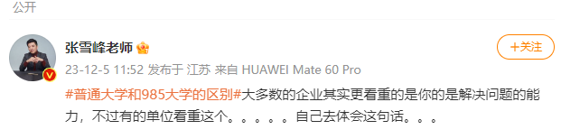 针对“普通大学和985大学的区别”这一话题,考研讲师张雪峰也发布动态表示: