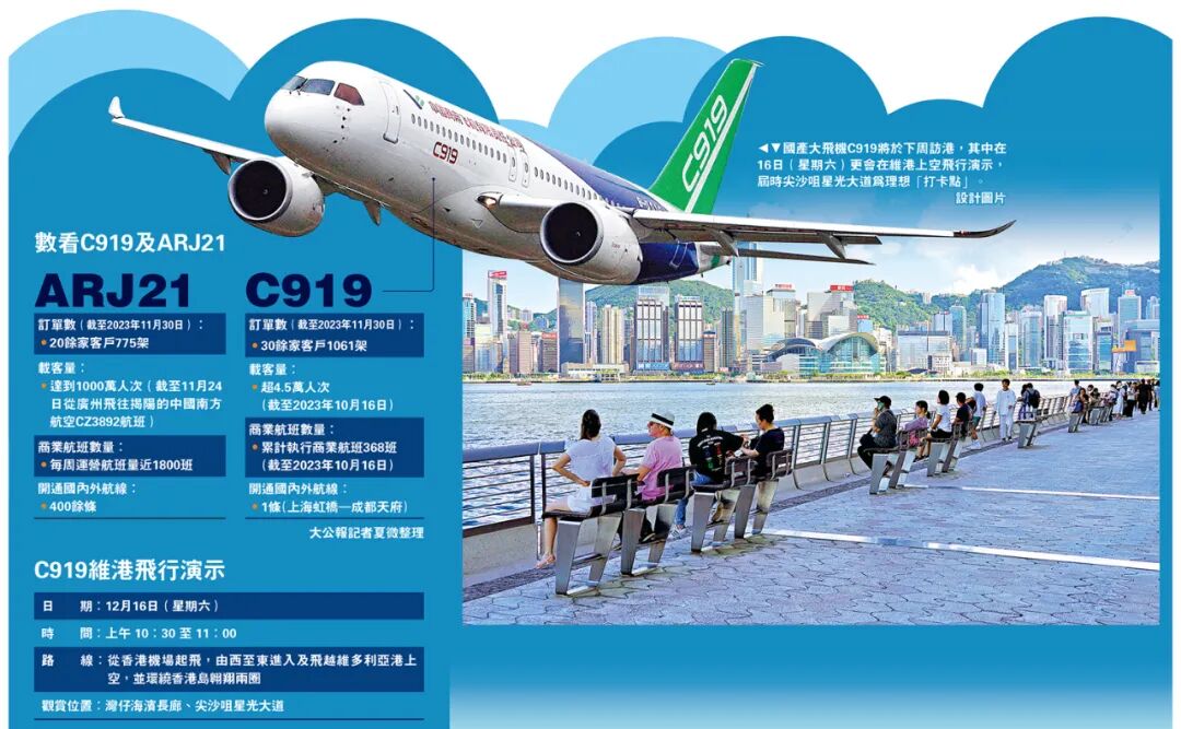 C919在16日(星期六)会在维港上空飞行演示,届时尖沙咀星光大道为理想“打卡点”。