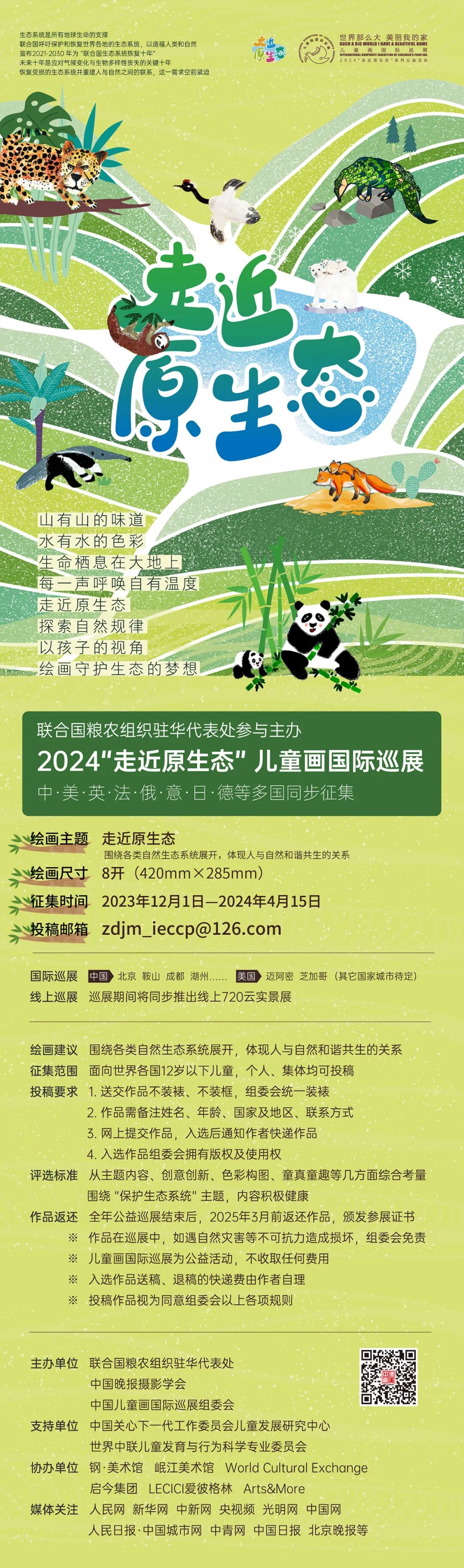 近日,由联合国粮农组织驻华代表处参与主办的2024 “走近原生态”儿童画国际巡展启幕。小朋友快来投稿吧,中国、美国、英国、法国、俄罗斯、意大利、日本、德国等多国同步征集!