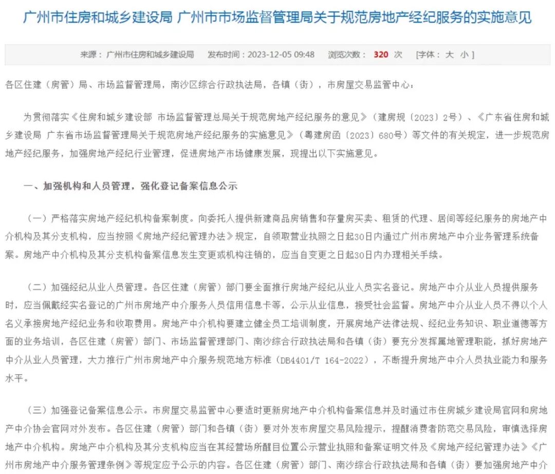 据了解,在广州此次发文之前,今年8月30日,广东省住房和城乡建设厅已联合广东省市场监督管理局发布《关于规范房地产经纪服务的实施意见》,明确要求房地产经纪机构要合理降低住房买卖和租赁经纪服务费用。