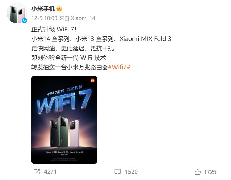 近日,小米通过官方微博宣布正式升级Wi-Fi7。小米14全系列、小米13全系列、Xiaomi MIX Fold 3将陆续升级支持。