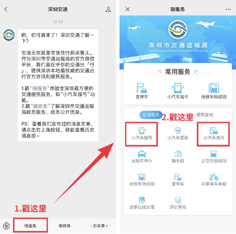 关注并进入“深圳交通”微信公众号-点击“微服务”菜单栏-点击“小汽车摇号”、“小汽车竞价”功能。