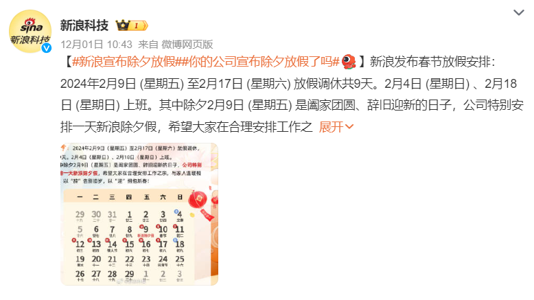 具体的放假理由大同小异,比如新浪表示,“除夕2月9日是阖家团圆、辞旧迎新的日子,公司特别安排一天新浪除夕假,希望大家在合理安排工作之余,与家人温暖相依,以‘辞’告别旧岁,以‘迎’拥抱新春!”