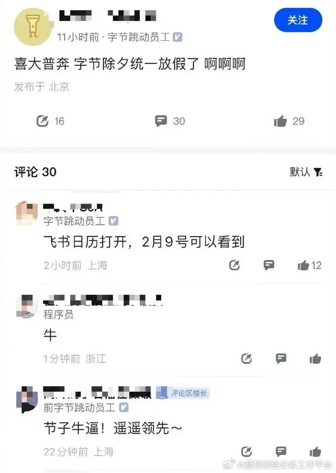 据海报新闻报道,10月30日,网传字节跳动宣布除夕统一放假,其办公软件“飞书”日历上,已显示除夕当天为“春节团聚假”。