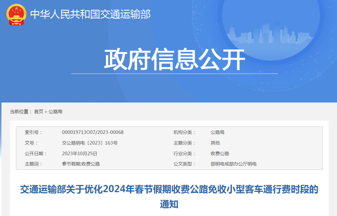 10月25日,交通运输部网站发布《交通运输部关于优化2024年春节假期收费公路免收小型客车通行费时段的通知》,提出: