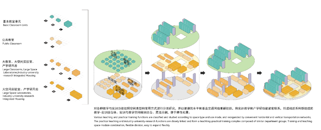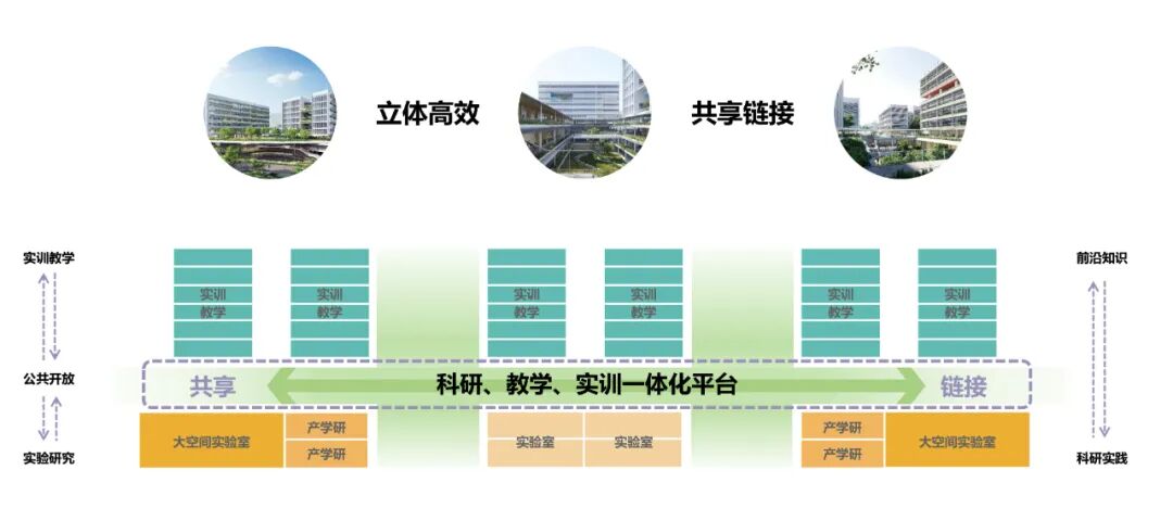 其次,项目将注重职教模式创新,利用垂直分层模式,形成底层岛状共享实训平台和上部实训楼组成的实训组团模式,功能布局强调模块化、弹性化特点,适应教学功能和模式的多样变化。岛状实训组团之间采用连廊联系,依托此连廊,可以将校园的住宿、教学、实训、图书、校城融合等功能区连成一体,提供全天候的开放交往系统,从而构建出弹性高效、模式清晰的新型职教校园。