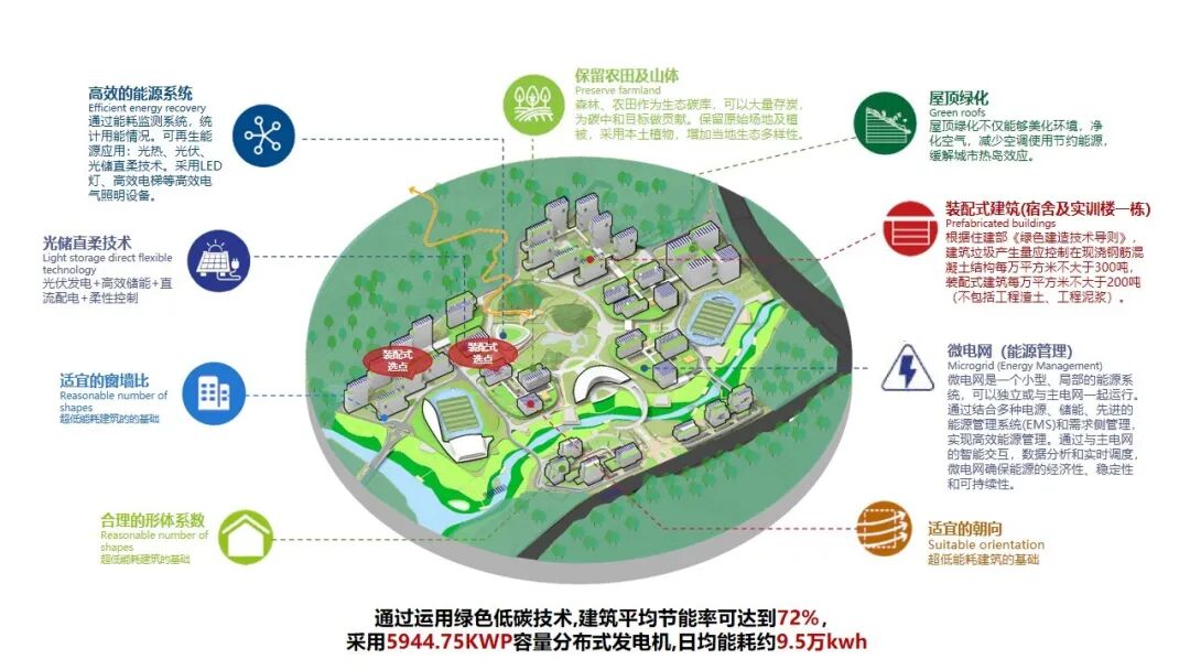 第四层面是方案通过基于自然友好的可持续校园规划,被动优先的气候适应性建筑设计策略,工业化装配式建造、光储直柔、微电网、智慧化管理平台等新技术新平台运用,打造具有示范性和引领性的近零碳绿色校园。