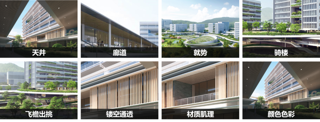 第三个层面是根植岭南文化和地域特色的设计,通过组团、建筑、景观等多维度系统性构建岭南新中式语境下的职业院校,强调校园与自然环境、建筑与园林景观、建筑内外空间的渗透交互,营建多元立体、开放共享的校园学习生活场景,激发学科交互与创新活力。设计将风廊、院落、天井、冷巷、骑楼、檐廊等传统营建智慧与新校园空间设计相结合,重构传统建筑符号语汇及地域材料,融合基于学科特色的新工业元素,塑造富有岭南特色的现代职业技术大学新风貌。