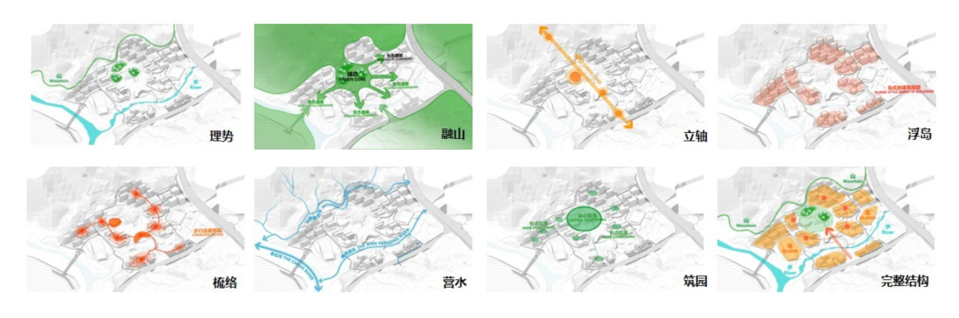 首先学校方案依托基地内外得天独厚的自然生态本底,以岭南建筑文化中人与自然和谐共生为核心设计理念,因地制宜采用集约紧凑的“浮岛式”组团化的布局策略,通过理势—融山—立轴—浮岛—梳络—营水—筑园等一系列设计操作,塑造以生态优先的自然山水校园格局。