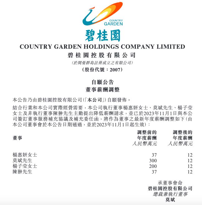 降薪前,杨惠妍、莫斌、杨子莹、陈翀年薪分别是37万元、300万元、200万元和37万元。公告称,上述4名董事已于2023年11月1日与公司签订董事服务补充协议及补充委任函,将作为董事之最新年度薪酬调整(由公司董事会于本公告日期通过,并于2023年11月1日起生效)。