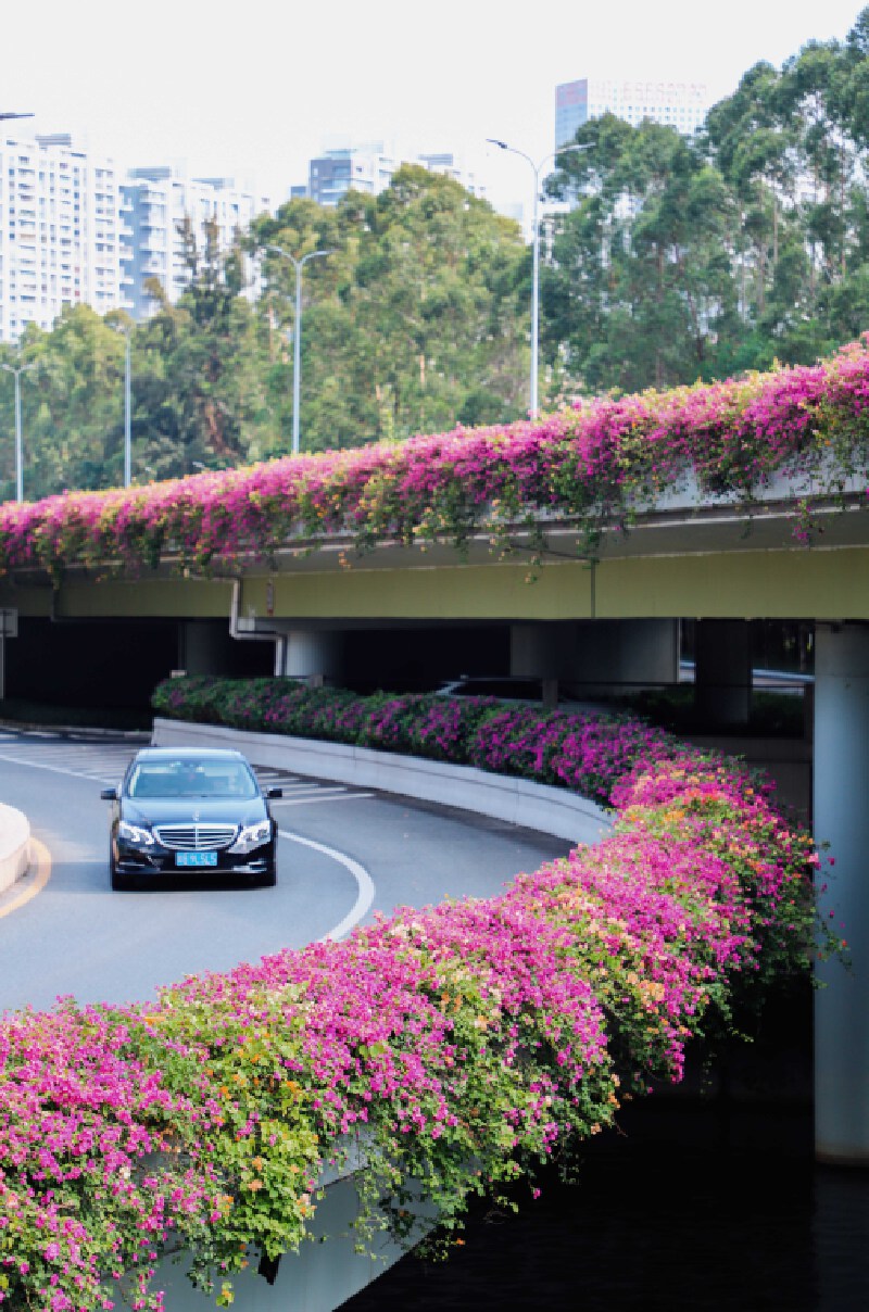 沙河白石天桥,每到十月,便成为这座现代都市中的一处绝美风景。立交桥被缤纷的三角梅环绕,五彩斑斓的花朵在阳光下交织在一起,形成一道让人驻足的风景线。