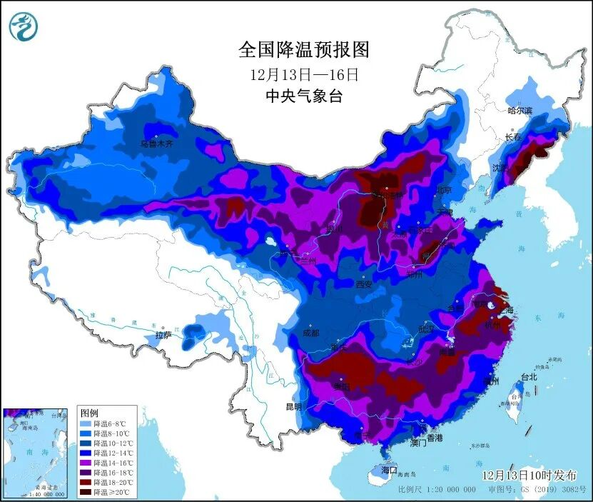 中央气象台12月14日10时发布寒潮橙色预警:预计,12月14日14时至12月17日08时,中国大部地区将自西向东、自北向南先后降温8~12℃。17日早晨最低气温0℃线可南压至贵州南部和江南北部一带,-10℃线位于黄淮北部至秦岭一带。华北、黄淮北部等地的部分地区最低气温将接近或跌破历史同期极值。