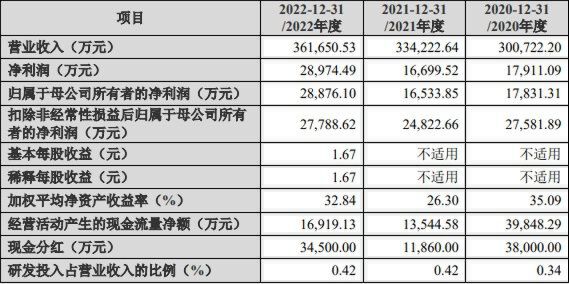 2020年-2022年,公司实现营业收入分别为30.07亿元、33.42亿元和36.17亿元,实现净利润分别为1.78亿元、1.65亿元和2.89亿元,扣除非经常性损益后归属于母公司所有者的净利润分别为2.76亿元、2.48亿元和2.78亿元。其中,2021年净利润出现下滑。