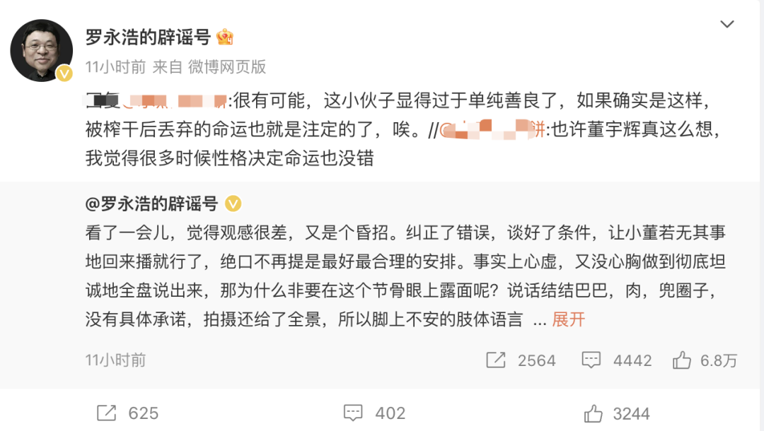 罗永浩称,“让小董若无其事地回来播就行了,绝口不再提是最好最合理的安排。”他还就这条微博回复网友评论,称董宇辉显得过于单纯善良了。