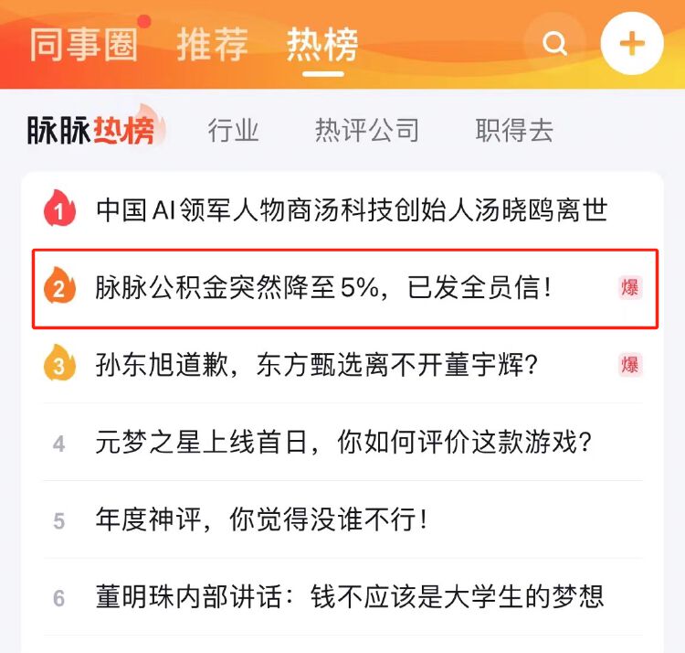 12月16日晚间,#脉脉公积金突然降至5%,已发全员信!#话题登顶脉脉APP热搜榜。截至发稿,该话题仍位于脉脉热榜第二,不少脉脉员工直呼“吃瓜吃到自己家”。