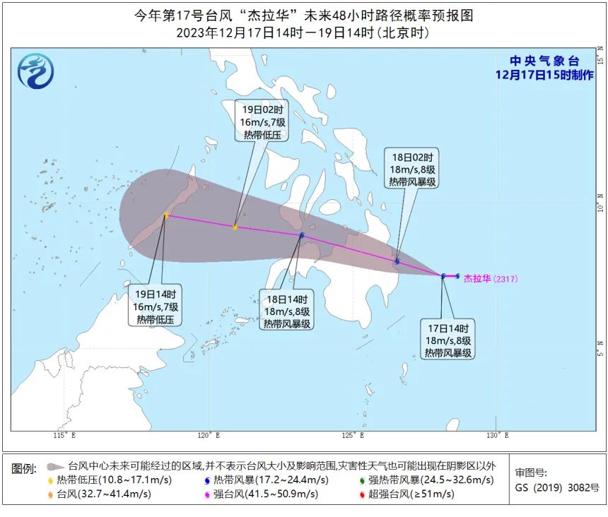 据中央气象台最新消息,“杰拉华”将以每小时15公里左右的速度向西偏北方向移动,强度变化不大,并将于今天夜间在菲律宾棉兰老岛东部沿海登陆,登陆时中心附近最大风力8级,而后强度缓慢减弱。