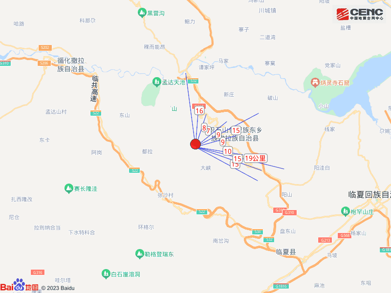 据悉,本次地震周边5公里内的村庄有黄草坪、大山庄、河崖村、积石山民俗村、尕护林、赵家地、大沟、盖新坪、怕沟湾、二沟,20公里内的乡镇有石塬镇、吹麻滩镇、刘集乡、柳沟乡、大河家镇、寨子沟乡、中咀岭乡、居集镇、郭干乡、关家川乡。