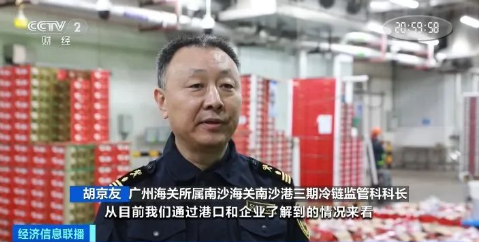 广州海关所属南沙海关南沙港三期冷链监管科科长 胡京友:从目前我们通过港口和企业了解到的情况来看,预计2024年春节之前,南沙港区共将接卸9艘(次)智利车厘子快船,总计约有8万吨车厘子进口。