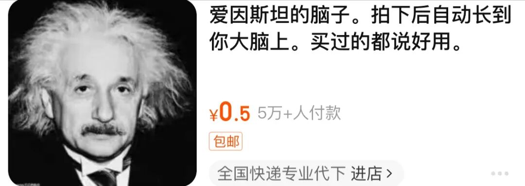 在今年的入选商品中,“爱因斯坦的脑子”独树一帜,它也是历年来首个入选淘宝年度商品的虚拟商品。这是近年兴起的一种情绪价值服务产品:卖家把爱因斯坦头像的图片挂在商品页上,通常标价几毛钱,号称拍下这个链接就能"自动长脑子"。