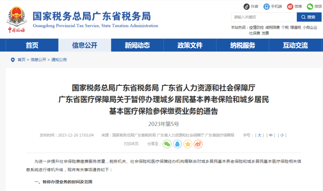 据国家税务总局广东省税务局12月26日消息,国家税务总局广东省税务局、广东省人力资源和社会保障厅、广东省医疗保障局发布《关于暂停办理城乡居民基本养老保险和城乡居民基本医疗保险参保缴费业务的通告》(以下简称《通告》)。