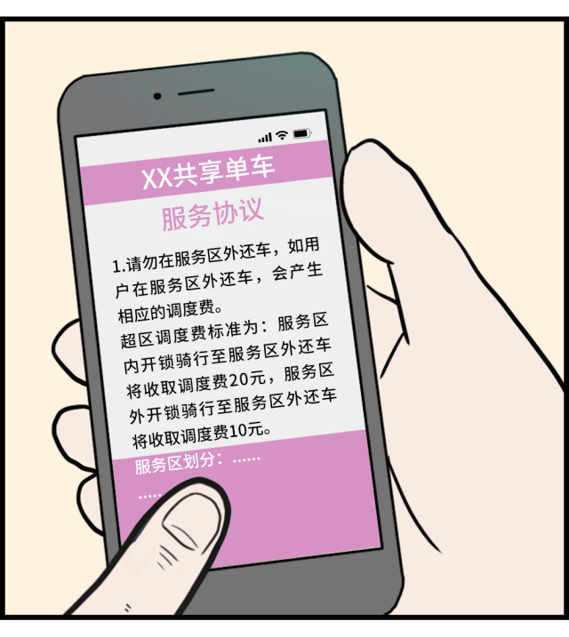 在漫画案例中,用户把车停在服务区外,不久后便重新扫码,将同一辆车骑行至共享单车的服务区内,最后依旧被收取调度费,这是为何?
