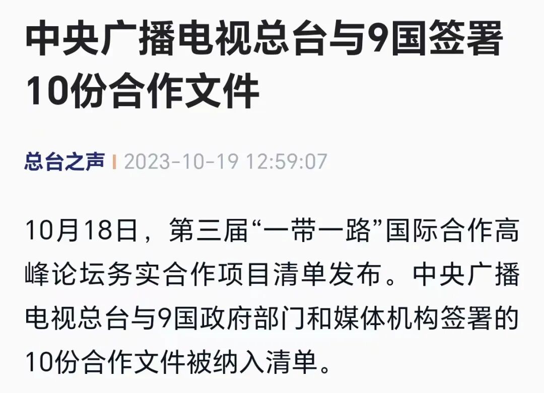 今年以来,总台与对象国政府机构和主流媒体共签署合作协议58份。其中,18份是在双方领导人共同见证下签署,33份纳入领导人会晤成果清单,多次将媒体间合作、媒体与对象国政府机构合作提升至国家战略高度,元首见证签约从创新性探索蝶变为“媒体外交”的“新常态”。