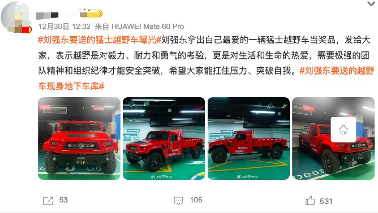 刘强东在帖子中称,要给大家加码送福利,拿出自己最爱的一辆猛士越野车当奖品,并表示越野是对毅力、耐力和勇气的考验,更是对生活和生命的热爱,需要极强的团队精神和组织纪律才能安全突破,希望大家能扛住压力、突破自我,让用户在京东感受到最好的体验。