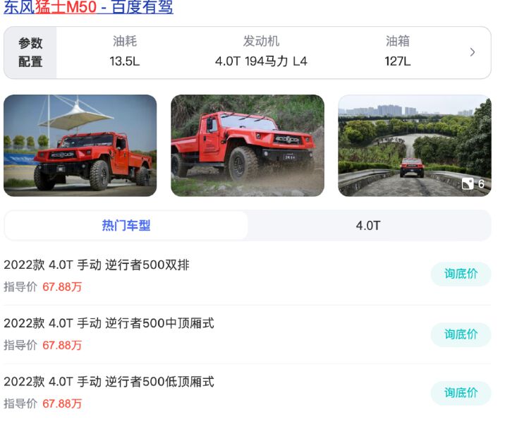 据百度资料,网络上曝光的刘强东所说的这台东风猛士M50,目前指导售价为67.88万元。