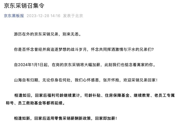 12月28日下午,京东发出“采销召集令”,喊话离职的采销员工“回家即加薪”。“采销召集令”称:“游历在外的京东采销兄弟,别来无恙。你是否怀念曾经并肩追逐梦想的战斗岁月,怀念共同挥洒激情与汗水的兄弟们?自2024年1月1日起,在岗的京东采销将大幅加薪,此刻我们也惦念着离家的你。山海自有归期,无论你身在何处,我们心怀感恩,张开怀抱,欢迎采销兄弟回家!”