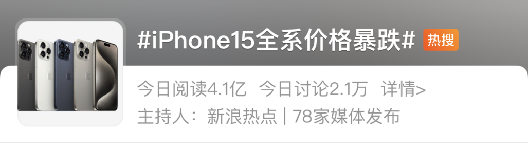上市一个多月iPhone15系列价格跳水的消息冲上热搜。微博话题截图