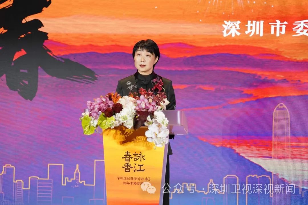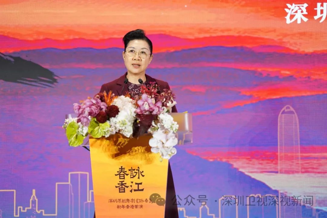 陈国基在致辞中表示,《咏春》是由深圳出品的原创舞剧,将中国武术与舞蹈完美结合,展现出深厚的岭南文化,并通过丰富的故事情节,表达出中国人民的拼搏精神。此外,《咏春》融入两个国家级的非遗项目——咏春拳和香云纱,再配上创意十足的周边产品,为国家的文创产业发展,注入新的活力。在国家“十四五”规划的支持下,香港正全力发展成为中外文化艺术交流中心。同时,我们全力加强与粤港澳大湾区城市的交流合作,包括拨款支持香港艺术团体和艺术家到大湾区演出,以贯彻落实《粤港澳大湾区发展规划纲要》中“共建人文湾区”的目标。随着《纲要》今年颁布五周年,香港将在10月担任第四届大湾区文化艺术节的主办城市,意义重大。我们将与大湾区城市携手合作,通过创新多元的方式,为广大观众带来多个精彩的演出,展现大湾区的文化软实力。