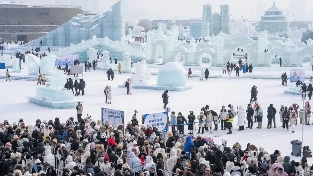 2024年1月1日,游客在哈尔滨冰雪大世界园区排队,等待体验超级冰滑梯。新华社记者 谢剑飞 摄