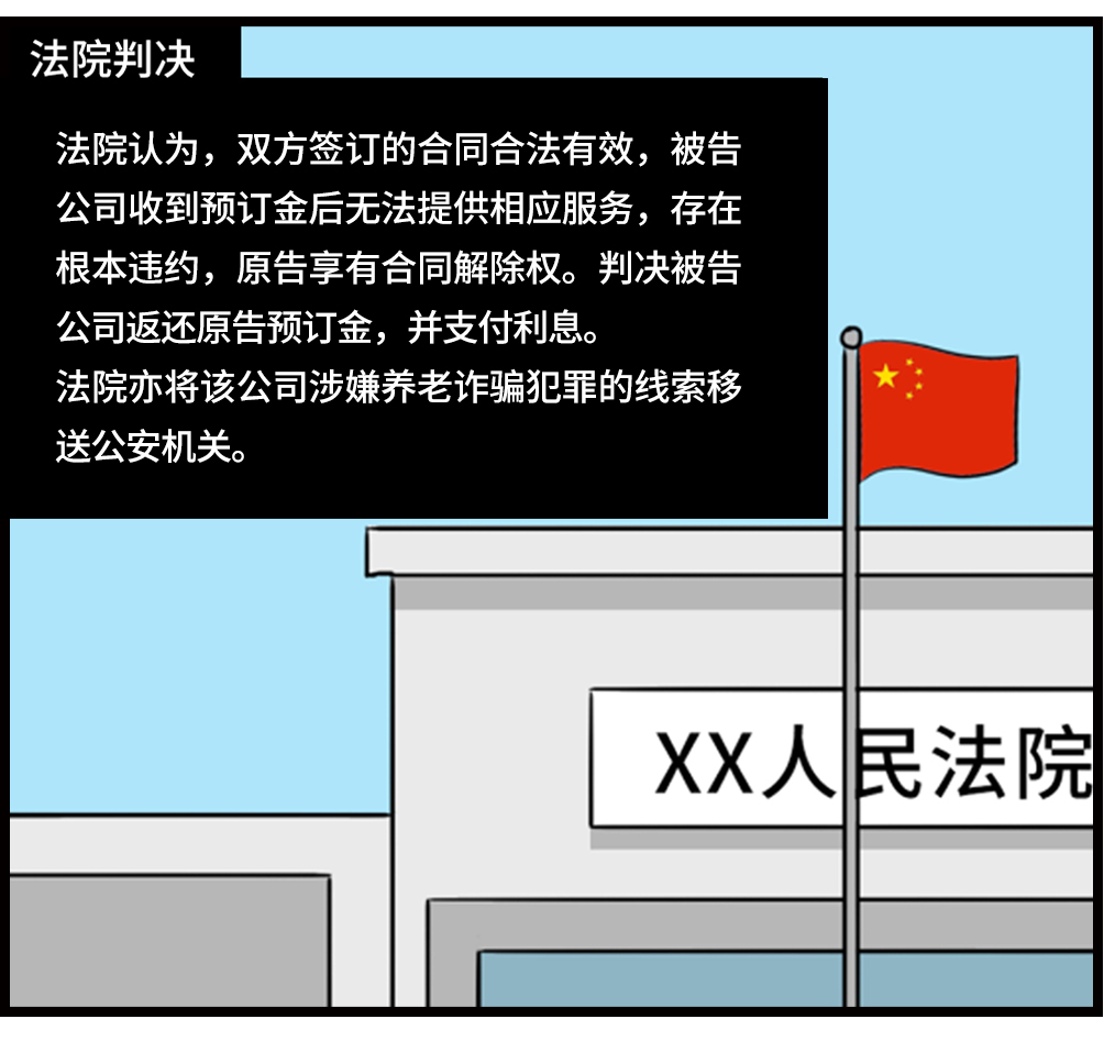 上述案例中,该公司以各项福利吸引刘爷爷刘奶奶与其签订了养生养老合同,却无法提供相应的服务,并拒绝退款。根据《中华人民共和国民法典》第五百六十三条规定,当事人一方迟延履行债务或者有其他违约行为致使不能实现合同目的的,当事人可以解除合同。最终,法院判决该酒店退还了刘爷爷的预订金并支付利息。因该酒店的行为涉嫌养老诈骗犯罪,法院亦将该线索移送公安机关。