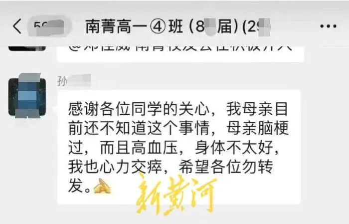网上信息显示,疑似孙某某弟弟的人在“校友群”中表示:“母亲不知道此事,身体不太好,自己也心力交瘁。”