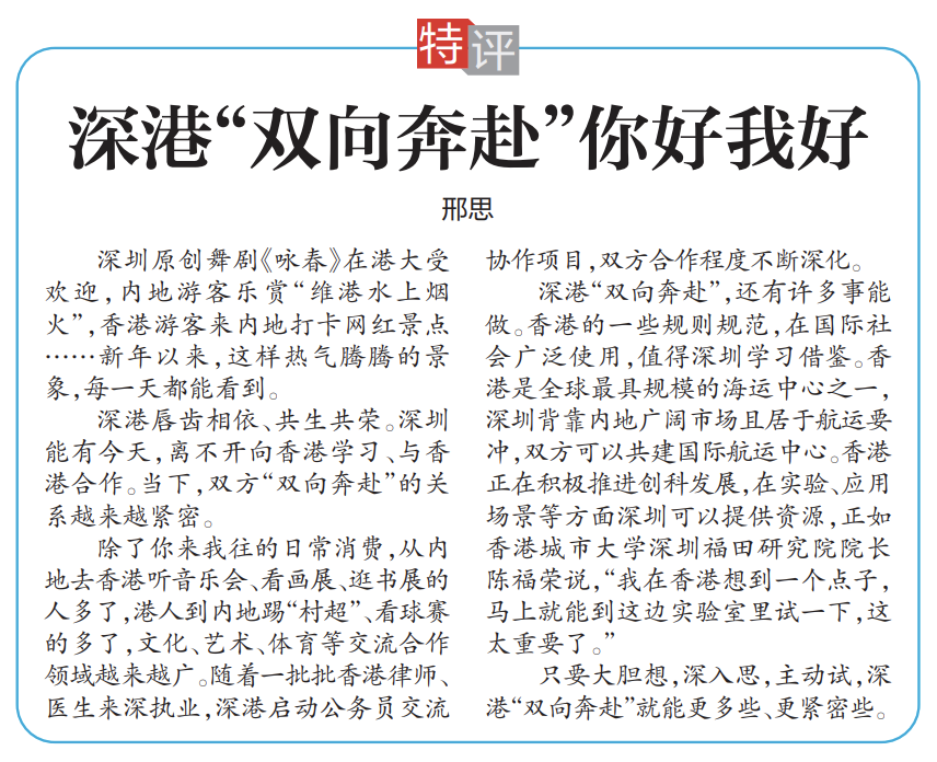 深港“双向奔赴”,还有许多事能做。香港的一些规则规范,在国际社会广泛使用,值得深圳学习借鉴。香港是全球最具规模的海运中心之一,深圳背靠内地广阔市场且居于航运要冲,双方可以共建国际航运中心。香港正在积极推进创科发展,在实验、应用场景等方面深圳可以提供资源,正如香港城市大学深圳福田研究院院长陈福荣说,“我在香港想到一个点子,马上就能到这边实验室里试一下,这太重要了。”